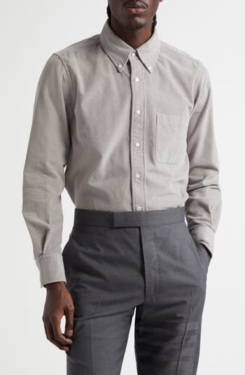 Thom Browne's signature tricolor locker loop and school-style name tag play up the preppy look of this Italian-crafted button-down cut from soft cotton corduroy.
