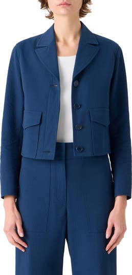 Bubbly textured seersucker enhanced with a bit of stretch brings casual ease to this cropped jacket tailored with high notched lapels.