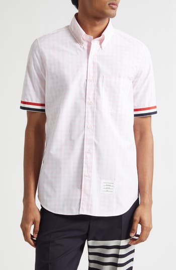 Thom Browne continues to bring his fresh vision to classic tailoring in a crisp cotton button-down patterned with bright gingham plaid and detailed with signature tricolor trim at the sleeves.