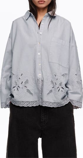 Straight-cut shirt in a cotton and linen blend. Features a button-up front, shirt collar, straight long sleeves with embroidery and lace at the cuffs, a chest patch pocket, and embroidery and lace detailing throughout.