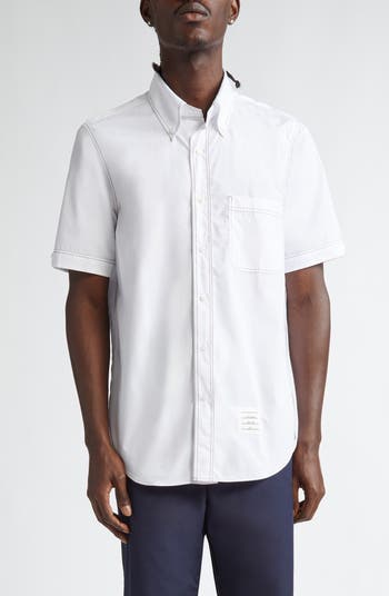 Thom Browne's nametag label and varsity-stripe back tab add signature touches to a short-sleeve cotton shirt traced with contrast topstitching.