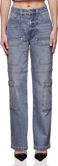 An angled yoke, bold seams and cargo pockets amplify the workwear vibe of these high-waisted carpenter jeans cut from cotton-blend denim with minimal stretch.