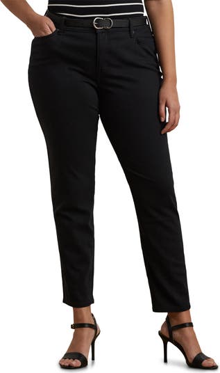 A solid black rinse polishes stretch-kissed jeans cut with a mid-rise waist and an ankle-grazing length.