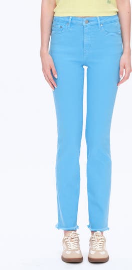 Relaxed straight legs and frayed hems enhance the laid-back appeal of these mid-rise jeans cut from stretch denim with a bold blue wash.