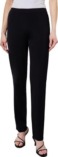 Staple black pants in a classic straight-leg silhouette wear beautifully in a wrinkle-resistant knit that stays neat and polished from desk to dinner.