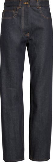An adjustable back strap with a striped grosgrain loop adds signature Thom Browne style to these relaxed-fit jeans crafted from structured Japanese selvedge denim. The 13.75-ounce denim is woven with off-white weft yarns that produce warmer, softer tones beneath the indigo dye. The raw finish is treated to reduce color transfer, preserving contrast while allowing the structured fabric to soften and evolve with wear. The selvedge stripe is on display when you cuff the hems.