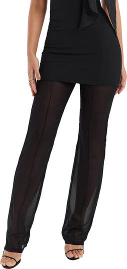 Date night is calling in these chic straight-leg pants that sit slightly low on the waist and become sheer mid-thigh for an edgy, modern look.