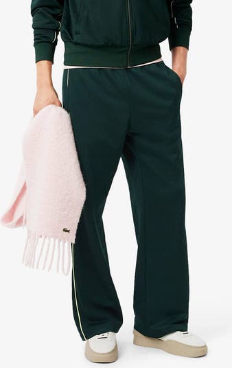 A relaxed straight-leg silhouette boosts the comfort level of these soft fleece track pants framed by contrast piping and handy pockets.