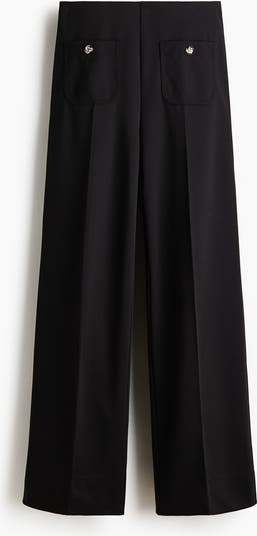 Trousers in woven fabric featuring a high waist with concealed elastication and patch front pockets with a button. Straight legs with creases down the front.