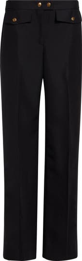 Golden snaps at the waist and front flaps bring a golden gleam to these straight-leg trousers tailored from wool-mohair hopsack prized for its exceptional breathability, crisp texture and wrinkle resistance.