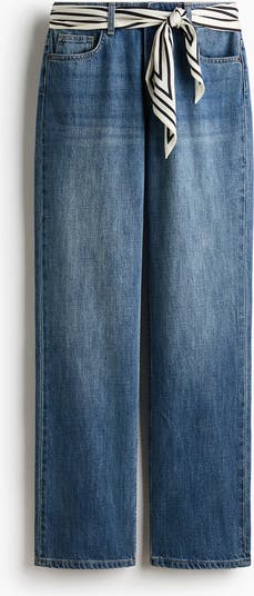 5-pocket jeans in rigid cotton denim featuring a straight leg with a regular fit from the waist to the hip and a looser, straight cut from the thigh to the hem. Regular waist with a zip fly and button. Comes with a scarf that can be tied around the waist for various styling options. Regular length, designed to hit the top of the foot with little or no stacking.