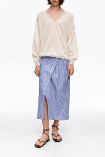 Sarong-style midi skirt crafted from cotton with side tie fastening. Finished with a frayed front detail for a relaxed look.