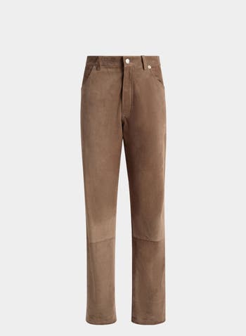 Created in soft sepia suede, these straight trousers bridge the gap between casual and statement.