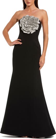 This strapless crepe gown features a stunning 3D rhinestone flower detail, offering a chic and sophisticated look perfect for formal events.