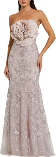 Strapless Beaded Applique Mermaid Gown With Flower