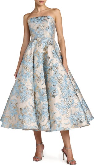 Polished and elegant, this strapless brocade dress features a blue metallic pattern and a full A-line skirt for timeless special-occasion style.