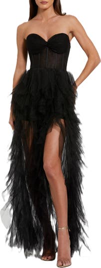 This strapless bustier net gown features spiral ruffles, creating a stunning and dynamic silhouette perfect for making a statement at any formal event.