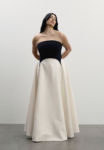 A strapless color-blocked gown cut from luminous duchess satin. Shaped by a close-fitting bodice that unfolds to a full, fluid skirt for an elongated silhouette.