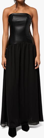 - The curved neckline of this corseted gown is mirrored by its waist seam, creating a unique strapless bodice. It’s fully lined on the interior, has internal front boning and features a discreet back zip closure. Fully lined Strapless curved neckline Invisible back zipper Front bodice boning Flowy skirt Maxi length Curved waist seam 100% Polyester Dry clean only.