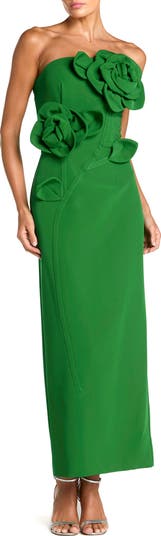Bold and modern, this strapless crepe gown features sculpted 3D floral detailing along the bodice and a sleek column silhouette.