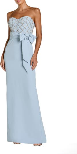 Step into elegance with this strapless crepe embellished bustier gown, featuring intricate embellishments and a dramatic bow for a chic, sophisticated look.