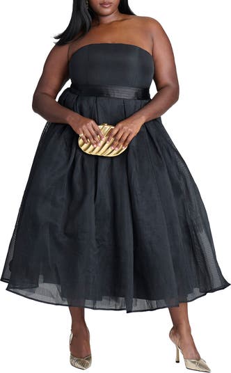 This strapless organza dress is lined with boning at the side seams and features a three-layer skirt with a satin bow, presenting a sophisticated and structured look.