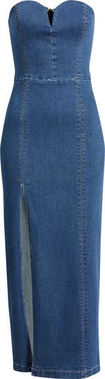 Cut from classic stretch denim, this figure-skimming maxi is made with a fitted shoulder-baring bodice and a leg-baring side slit.