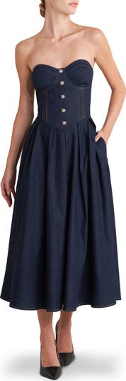 A corset-like bodice shapes the silhouette of this dark-wash denim midi finished with a perfectly flared skirt.