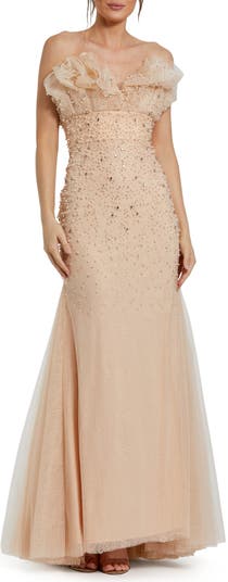 This strapless mermaid gown features an embellished tulle design, creating a glamorous and elegant silhouette.