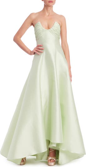 Make a statement in this glossy satin ballgown designed with a full high-low skirt and a striking curved neckline that shows off your shoulders.