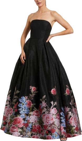 Exquisite strapless brocade ballgown with floral detailing at the hem—elegant, regal, and perfect for making a timeless statement.