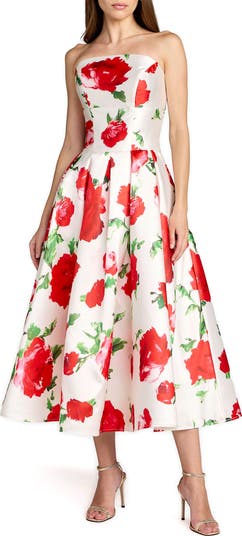 Strapless Floral Printed A Line Midi Dress