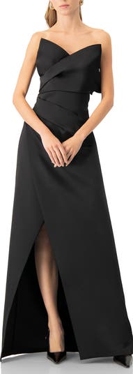 Elegant strapless long dress featuring a stylish front slit for a sophisticated look.
