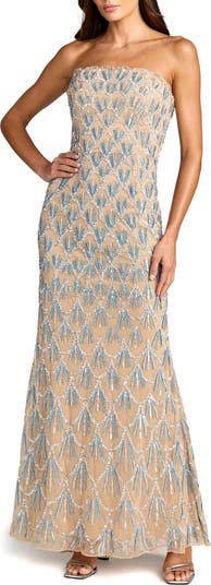 Striking and elegant, this strapless gown features shimmering blue and silver sequin beadwork that fans across the silhouette for glamorous evening appeal.