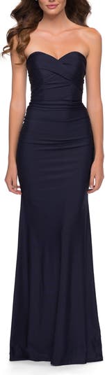 Strapless jersey gown with sweetheart neckline and ruching throughout. Back zipper closure.