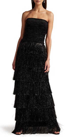 Strapless Metallic Fringe Gown