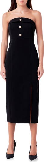 Embossed goldtone buttons decorate the bodice of this sleek, strapless midi cut with a leggy slit at the hem.