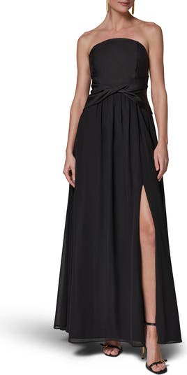Get glasses raised in a deeply elegant gown designed with a lustrous mikado bodice that gives way to a frothy georgette skirt, slashed with a side slit best shown off on the dance floor.