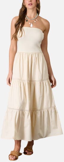 A mix of materials defines this strapless midi dress designed with a fitted rib-knit bodice that offers a flattering, close fit. The crisp cotton poplin skirt falls into a flared, tiered silhouette finished with delicate crochet trim for subtle texture.