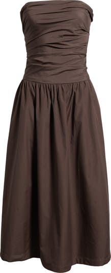 Crafted from crisp, 100% cotton poplin, this strapless midi dress has ruching at the front of the bodice and ties at the back. It's perfectly elevated yet effortless.