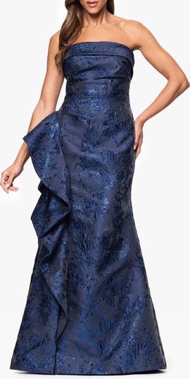 Lustrous brocade enriches a mesmerizing evening gown featuring a shoulder-baring silhouette and voluminous ruffles that cascade down the voluminous skirt.