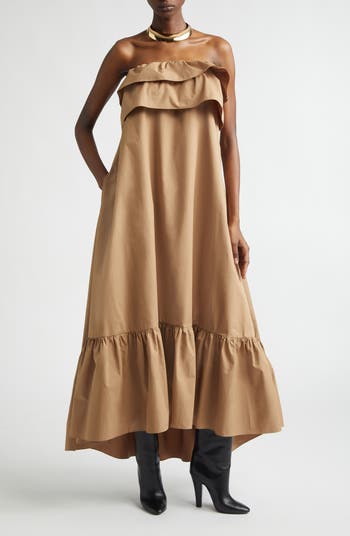 From the ruffle-ruled spring '26 collection comes this strapless cotton maxi that playfully plays by the frill-volous rules.
