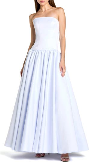 Elegant and modern, this strapless satin gown features a structured drop-waist bodice and a full A-line skirt with hidden pockets for effortless sophistication.