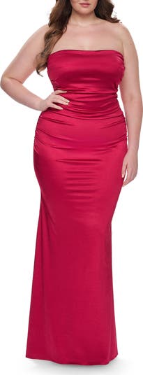 Strapless chic stretch satin plus size gown with flattering ruching. Back zipper closure.