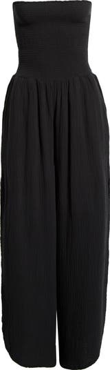 Made of breathable cotton-gauze, this strapless jumpsuit features a stretchy smocked bodice and flowy wide legs that are perfect for breezy days.
