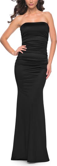 Chic strapless stretch satin dress with flattering ruching detail. Back zipper closure.