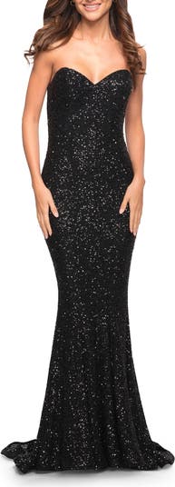 Dazzling soft luxurious sequin gown with strapless sweetheart top. Back zipper closure.