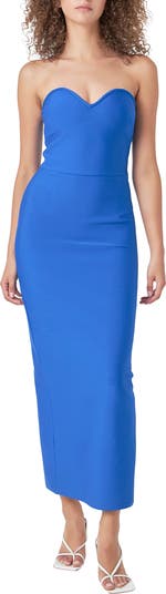 Take your summery night-out look to the next level in this strapless sweetheart-neck dress cast in a vibrant blue shade.
