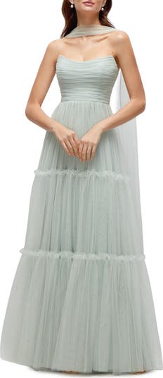 Feel your most stunning in this tiered gown featuring an ethereal tulle overlay and a slender waist tie that can be worn as a scarf.