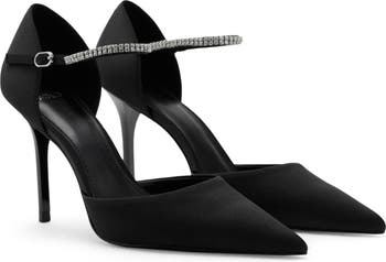 A sparkly rhinestone-embellished strap boosts the glamour of this satin d'Orsay pump balancing a chic pointed toe with a sleek stiletto heel.
